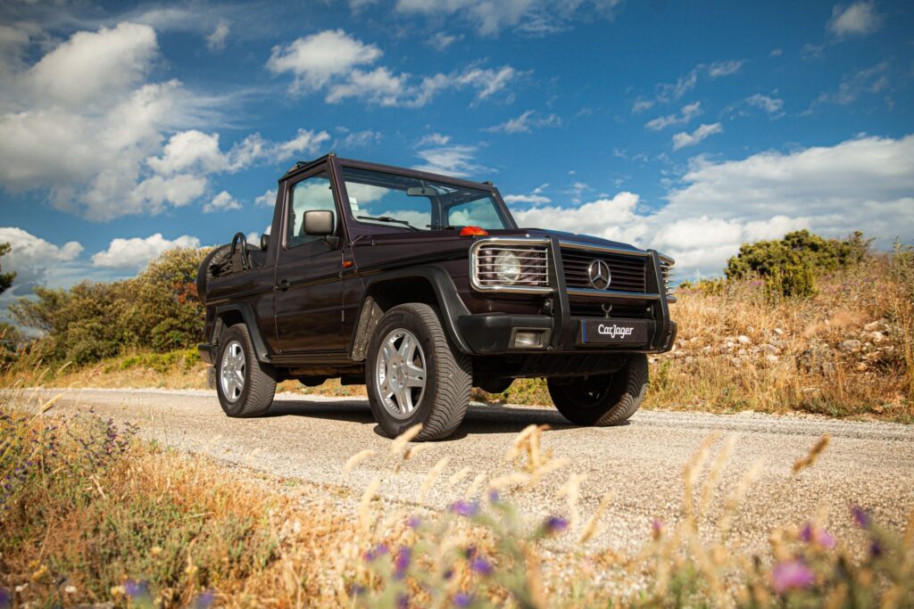 This Mercedes-Benz 300GE Cabriolet presents itself as an impeccably maintained, beautifully cared-for example, showing no signs of damage and offering an exceptional overall condition. Finished in refined Bornite Brown Metallic with a black soft top, this open-top G-Class combines iconic design with impressive mechanical capability. It is powered by a smooth 3.0-liter inline-six paired with a four-speed automatic transmission, complemented by a dual-range transfer case and three locking differentials for true off-road confidence. The exterior features 18″ Ashtaroth alloy wheels, a front brush guard, fog lights, and a tailgate-mounted spare wheel. Inside, the cabin is upholstered in black leather and accented with wood trim, offering heated front seats, power windows, and a cassette stereo upgraded with Bluetooth connectivity for modern convenience. A leather-wrapped four-spoke steering wheel frames traditional Mercedes instrumentation, while the overall presentation of the vehicle reflects careful use and attention over time. Classic, capable, and highly collectible, this 300GE Cabriolet stands as a rare opportunity to own a timeless open-air G-Class in excellent condition.