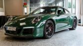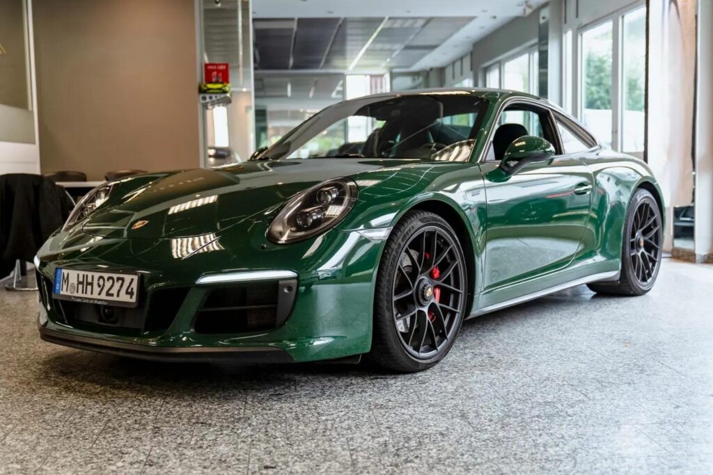 A 2017 Porsche 911 991.2 Carrera 4 GTS in the striking special color British Racing Green with black leather interior.